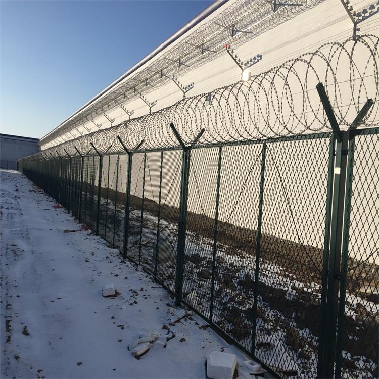 圍墻。近幾年全國各地監獄都在進行改造。很多設計院工程師詢問我公司監獄隔離網的常用規格尺寸,以及規格規范。今天就為大家簡單介紹下監獄隔離網常用規格尺寸以及規范。圍墻隔離網原材料主要采用高強度低碳鋼絲焊接成型,上部加Y型固定支架。由焊接鋼網結合刀片刺網組合而成。