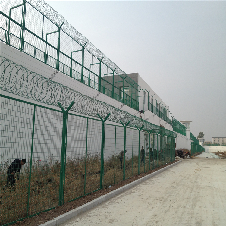 監獄鋼網墻生產廠家、公安局戒毒所鋼網墻,監獄 鋼網墻的生產構造:由刀片剌繩、鋼絲網片與立柱組和而成。它主要采用不同規格的的金屬鐵絲經焊接(編織)加工成網狀,主要絲徑有4.0m,4. 8mm, 5mm, 6mm。 網片加工的網孔規格有: 50X50m,70X1 50mm,80x1 60mm等等。網片兩側的防護立柱采用國標尺寸:圓柱:直徑48mmX2mm圓管 ,直徑60X3mn圓管,直徑80mmX5mn圓管等等:方管40X40nmX2. 5mm,48X48X3mm, 60X60X3mm等等。 客戶可根據實際要求選購。