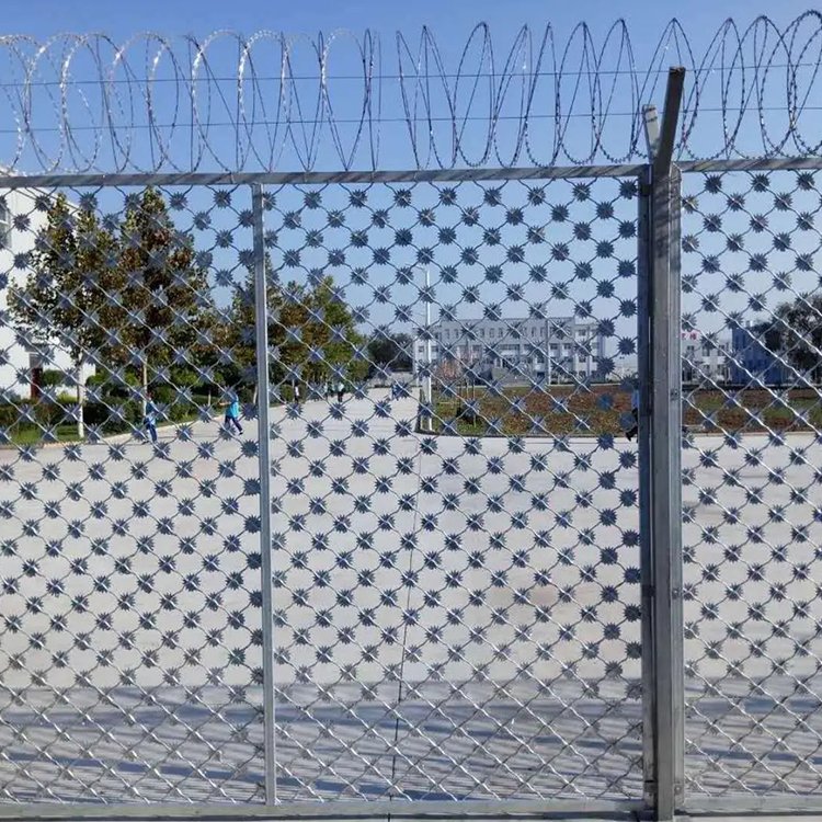 最后巡邏道刀刺網(wǎng)頂部的蛇腹形防攀爬網(wǎng)。刀刺防攀爬網(wǎng)的直徑一般是50公分和60公分。看守所武警巡邏道刀刺網(wǎng)是高墻上面安裝防止犯人逃跑設(shè)計(jì)必須要高架上面安裝蛇腹形防攀爬網(wǎng),可以防止攀爬不容易翻越從而起到很好的防護(hù)作用。