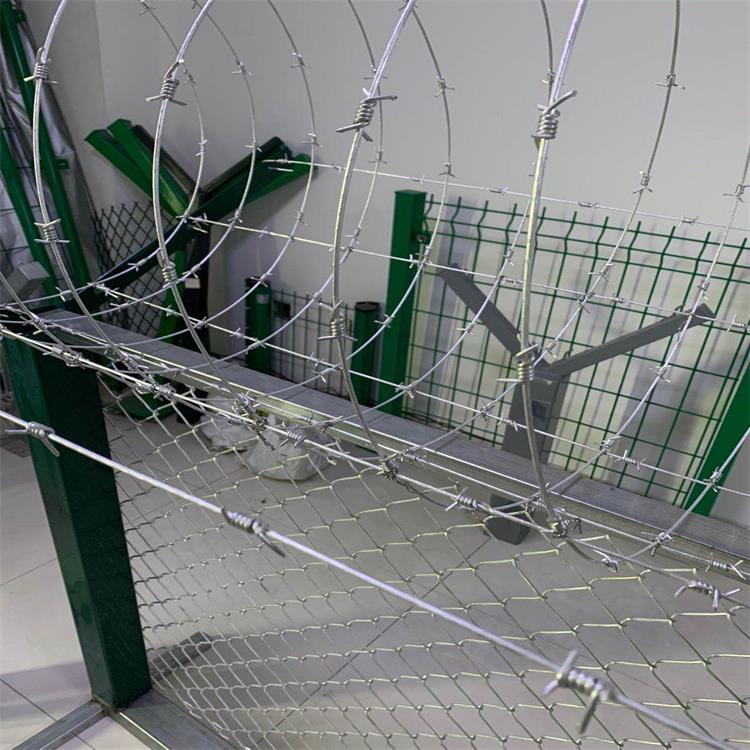 鋁包鋼絲菱形網采用冷拉低碳鋼絲外徑包裹鋁層的防腐處理,鋁包鋼絲抗拉強度應達到500Mpa,立柱采用由冷軋鋼帶直縫焊接而成的矩形燕尾鋼管并做內外防腐處理,要求鋼帶抗拉強度應達到375Mpa;斜撐采用由熱軋鋼帶直縫焊接而成的矩形鋼管并做內外防腐處理,要求鋼帶抗拉強度應達到375Mpa。延伸臂由熱軋角鋼焊接而成并做防腐處理,要求抗拉強度應達到375Mpa。鋁包鋼絲滾籠為主絲直徑3.0mm的冷拉高碳鋼絲,抗拉強度應達到1340Mpa;刺絲為直徑2.2mm的冷拉低碳鋼絲,抗拉強度應達到500Mpa,鋁包鋼刺絲為主絲直徑2.8mm的冷拉高碳鋼絲,抗拉強度應達到1340Mpa;刺絲為直徑2.2mm的冷拉低碳鋼絲,抗拉強度應達到500Mpa,間距均為100- 200mm。鋁包鋼絲滾籠與刺鋼絲采用不銹鋼扎絲連接,沿長度方向每隔500mm設4個連接處。