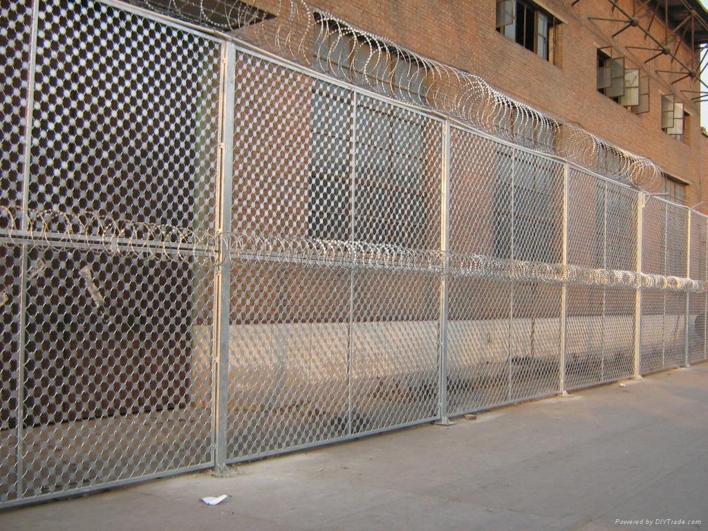 (3)監(jiān)獄物理隔離網(wǎng)頂部的蛇腹型刀刺網(wǎng)與v型托網(wǎng)之間用適量固定卡子或用2-3條直徑3.0mm不銹鋼絲加固,鋼絲穿過(guò)V型托預(yù)留孔拉直固定。