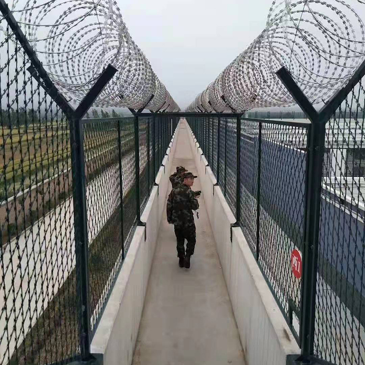 具有防攀爬、抗沖擊、抗剪切特性和杰出的震慎作用,專用于監(jiān)獄、看守所、警戒線軍事基地等高安全范疇。監(jiān)獄、看守所巡查道阻隔網上部裝置刀片剌網(刺絲滾籠) , 刀片剌網具有嚇阻、防翻越等效果。