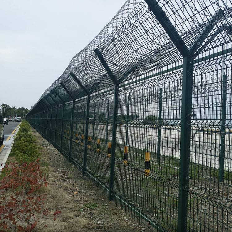 機場圍界網常用的兩種結構樣式有有雙邊絲款及框架款隔離網,而2.5米高民用機場圍界網是一種高安全隔離防護網,一般由鋼筋焊接網、Y型防護立柱以及蛇腹式刀刺網等幾大主體組成。不但有良好的通透性,又能起到強有力的安全隔離防護效果,發揮著保護機場強有力的作用。