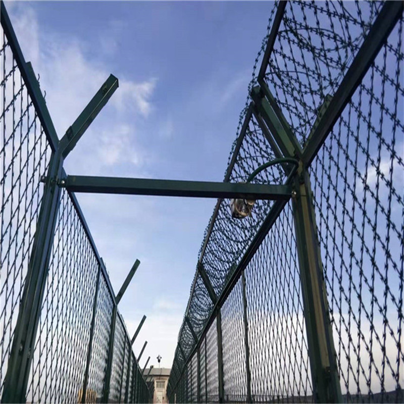 監獄外圍鋼網墻 內墻鋼網墻 圍墻鋼網墻一般頂端都設有V型支架與立柱焊接。材料通常選擇和立柱同等材料或者稍小規格材料搭配使用。V型支架的加裝是為了將蛇腹形刀刺網固定在鋼網墻頂部,從而有效的增加監獄鋼網墻的防攀爬性和安全性。V型支架加裝防拆卸刀刺網。刀刺網的直徑一般為500mm、600mm、800mm,材質均為優質304不銹鋼,鎳含量8個以上。刺網芯線直徑為2.5mm、刀片長22mm,刀片寬度15mm,刀片厚度0.5mm。 蛇腹形刀刺網的排列密度不小于10圈/米,相鄰每圈間距不大于150mm 。監獄用的刀刺網通常卡扣之間的距離是120mm,直徑500mm的刀刺網,覆蓋一米的重量約為1公斤