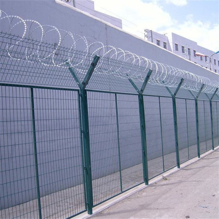 監獄護欄網又名監獄鋼網墻、鋼網墻監獄防護網;主要由蛇腹式高強度刀片刺網,又名刀片刺繩,Y型方(圓)管高碳鋼絲焊接網片,v型鋼絲焊接網與安全防盜銜接件組合而成,是由高碳鋼絲編制焊接而成,高度上下兩頭折彎以添加網片強度,網片平坦、網孔均勻、焊接結實、無虛焊無漏焊表象,具有防攀爬,抗沖擊,高安全防護特性特性,有用避免人員,牲畜進入。